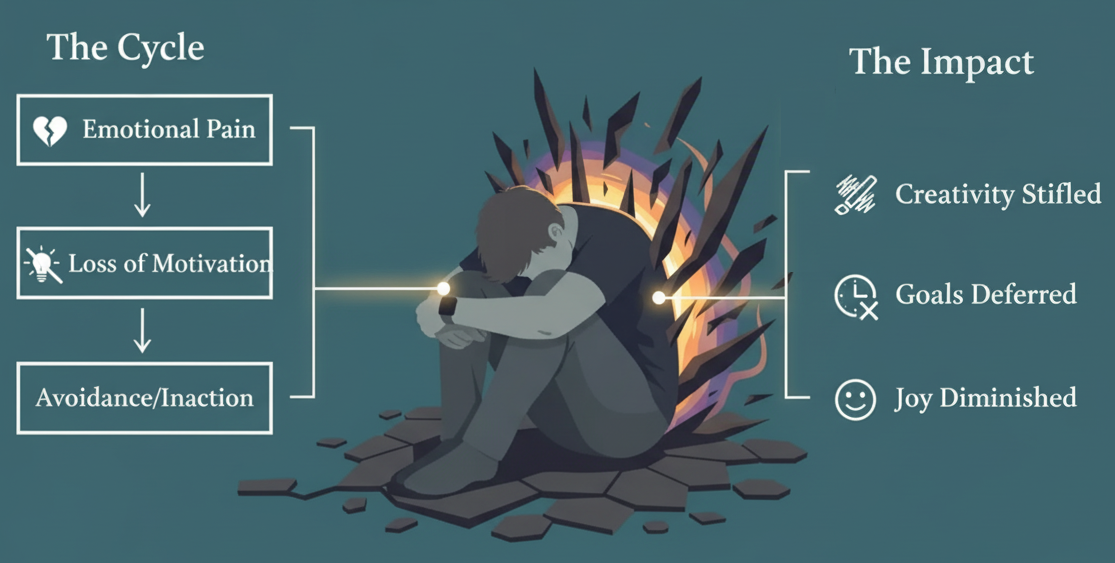 Stress on the body: Emotional pain affects physical health too. Fatigue, headaches, and tension make it harder to focus on creative projects.